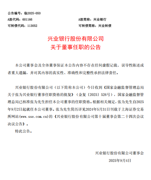 9月4日,兴业银行股份有限公司发布对于董事任职的公告十大正规体育平台,国度金融监督科罚总局已核准张为先生担任本公司董事的任职履历。