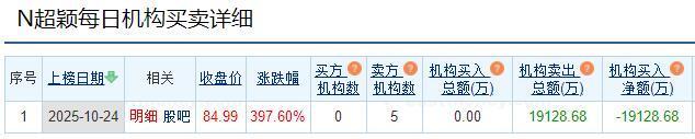 龙虎榜数据表现,卖出超颖电子金额最大的前五名中,一齐为机构专用席位。经统计,机构席位当天卖出超颖电子净额为19128.68万元。